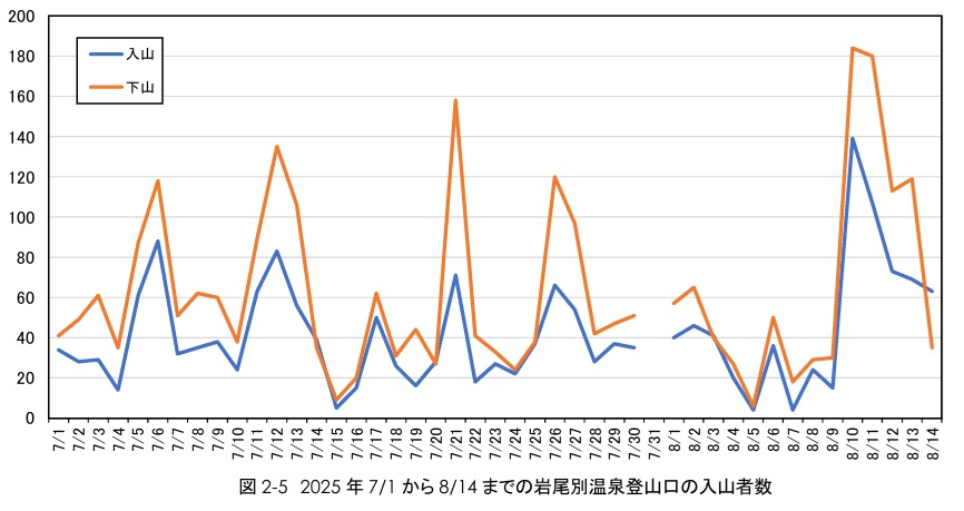 グラフでは、7/1~8/14における入山者数は約1800名であり、1日の平均は約40名です。