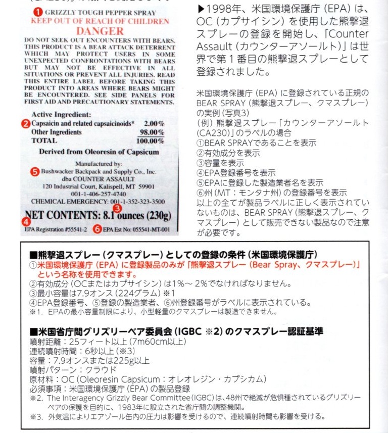 ※ネット上では、米国製の熊よけスプレーと外観がそっくりな商品で、ラベルにEPA登録番号のないものが複数出回っています。EPA登録品には、ラベルに登録番号が必ず表示されています。EPA登録品の購入を考えている方は、ラベルや商品説明などをよく確認する必要があります。